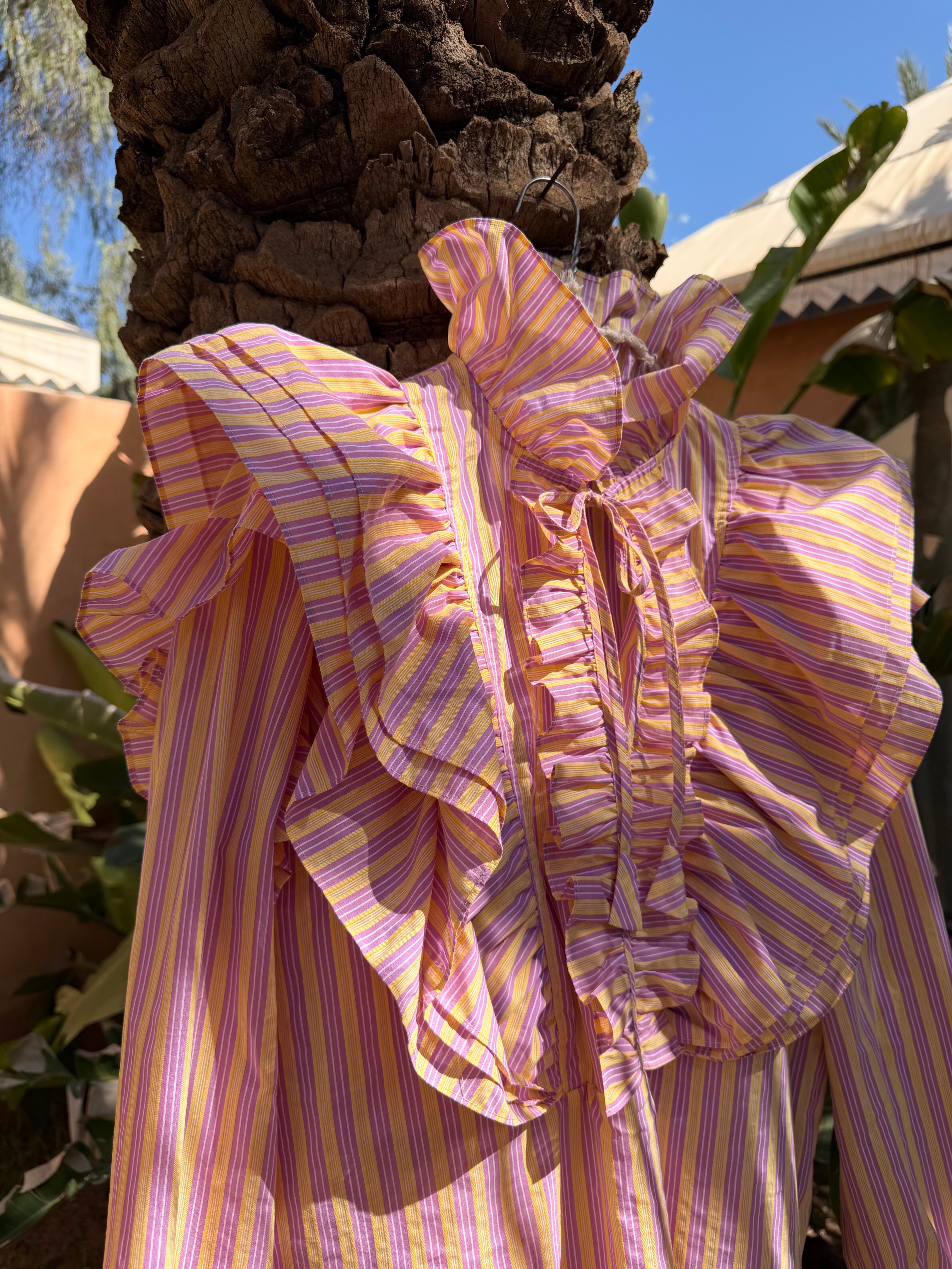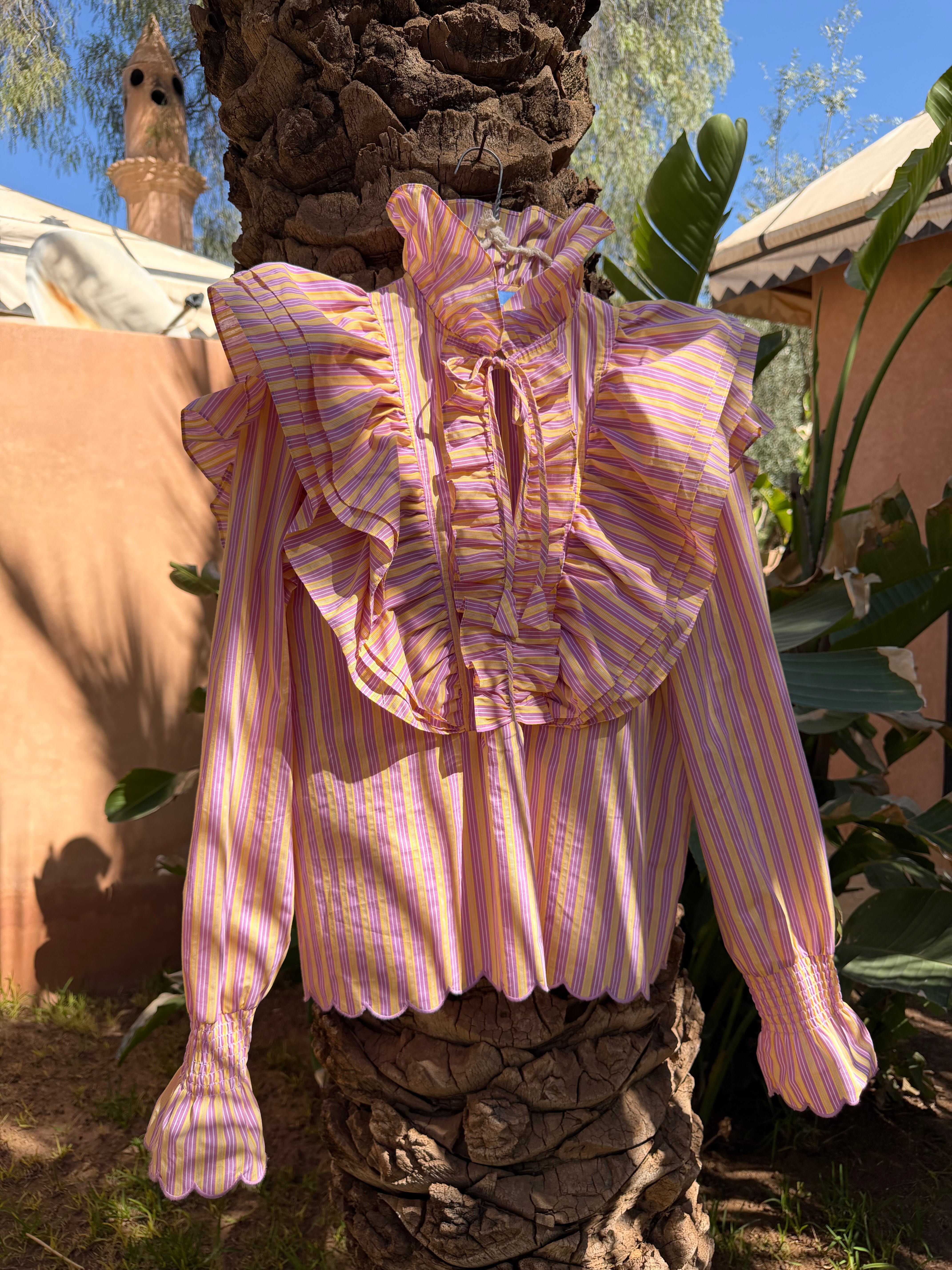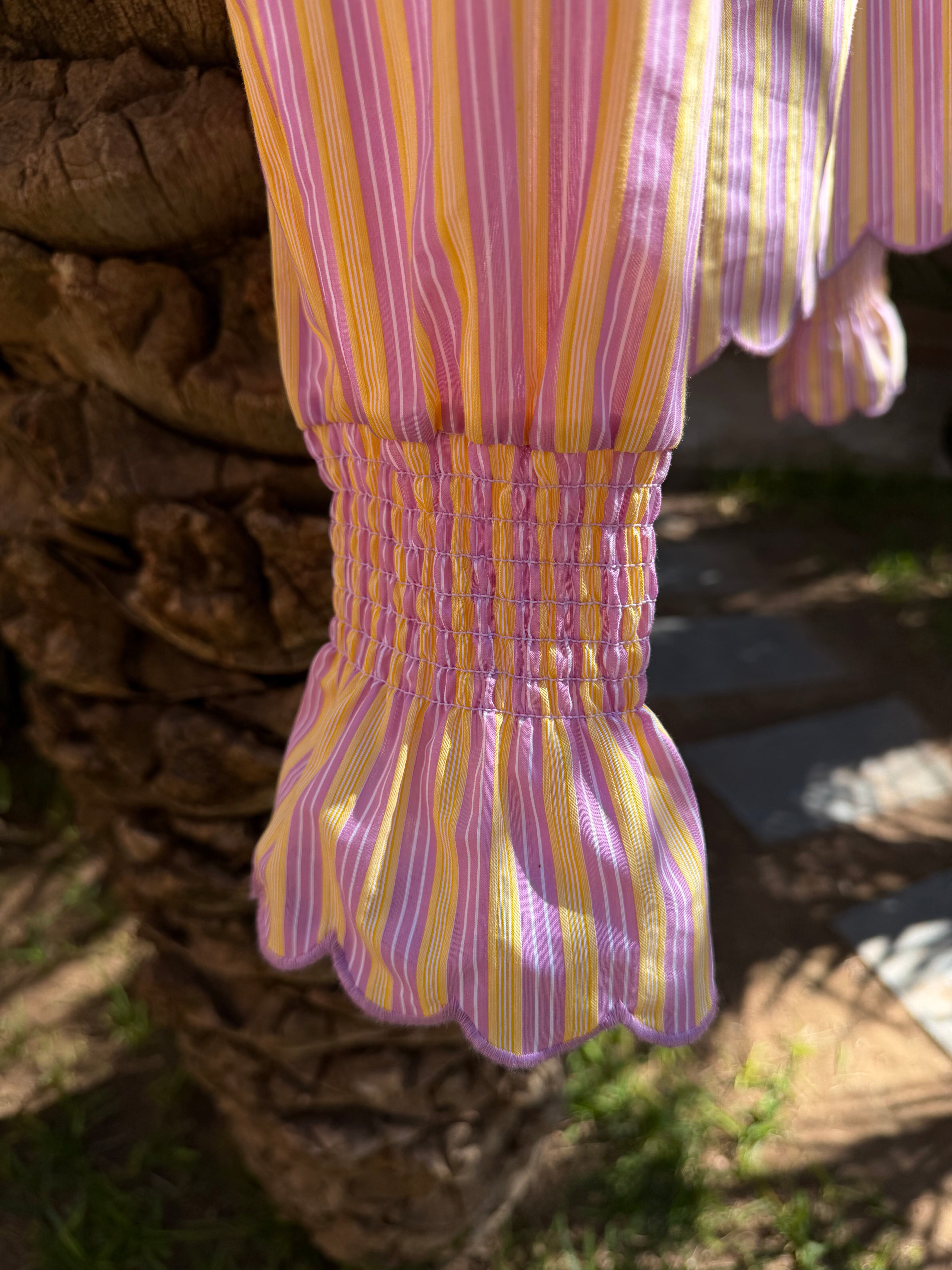 A love letter to spring. Introducing the SILENT ROSE HEAT SHIRT, a piece designed to bring a touch of romance to your everyday wardrobe. The cheerful yellow and pink stripes are complemented by a beautiful scalloped edge on the sleeves and bottom, adding a delicate, vintage-inspired charm. It is a silhouette that embraces both comfort and effortless grace.Perfect for sun-drenched afternoons and heartfelt conversations.
