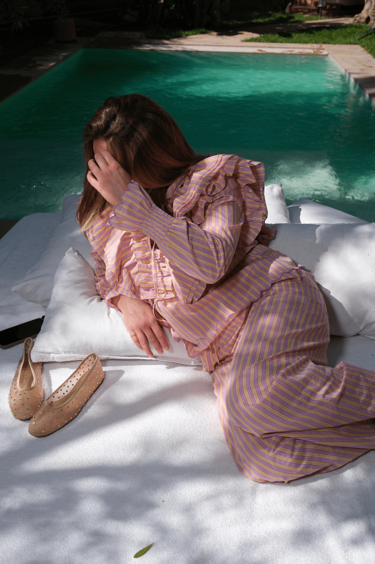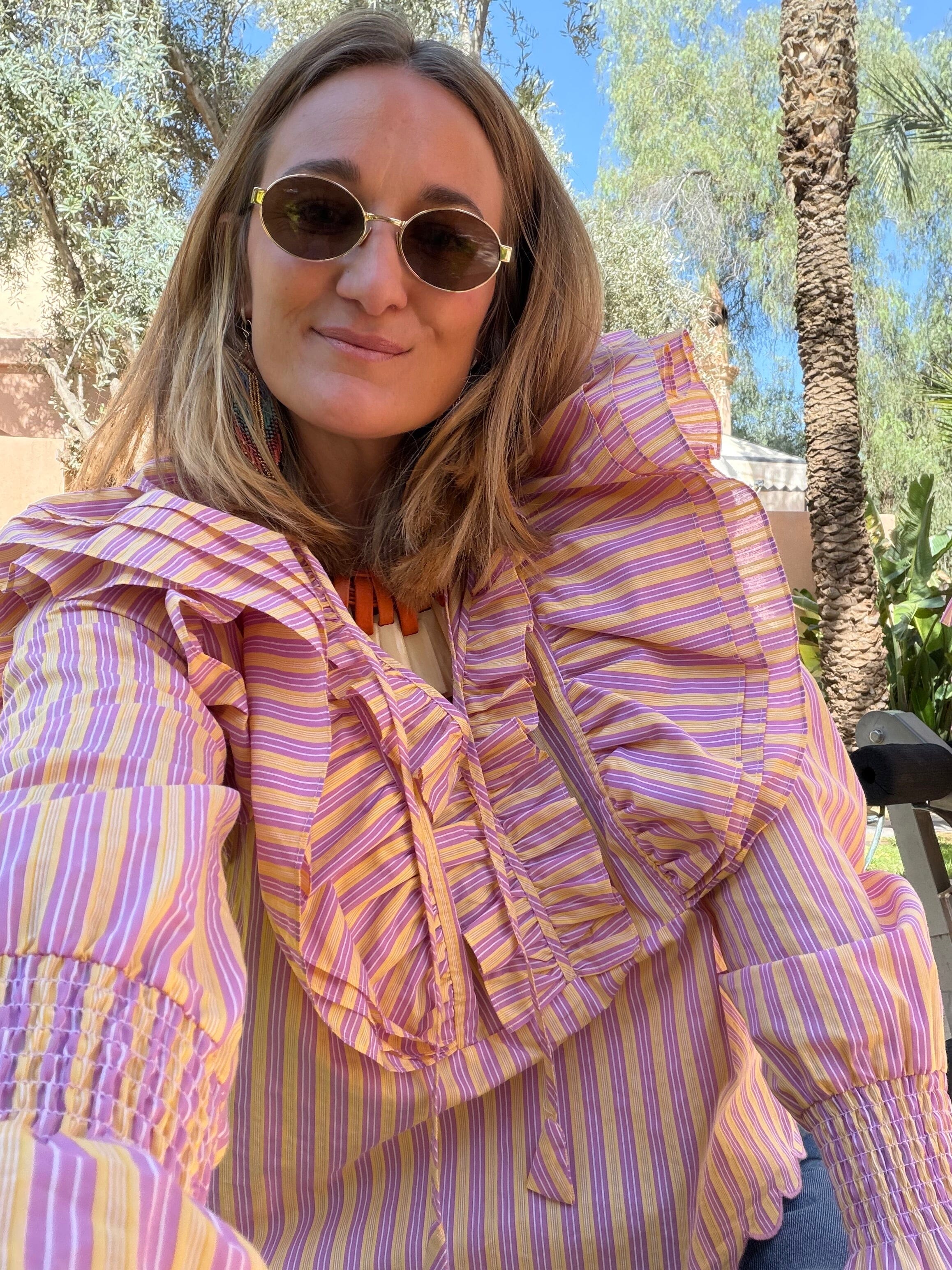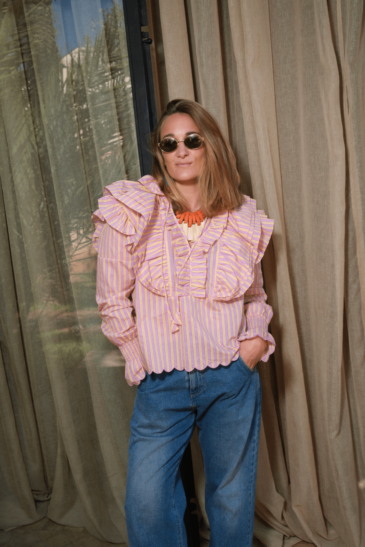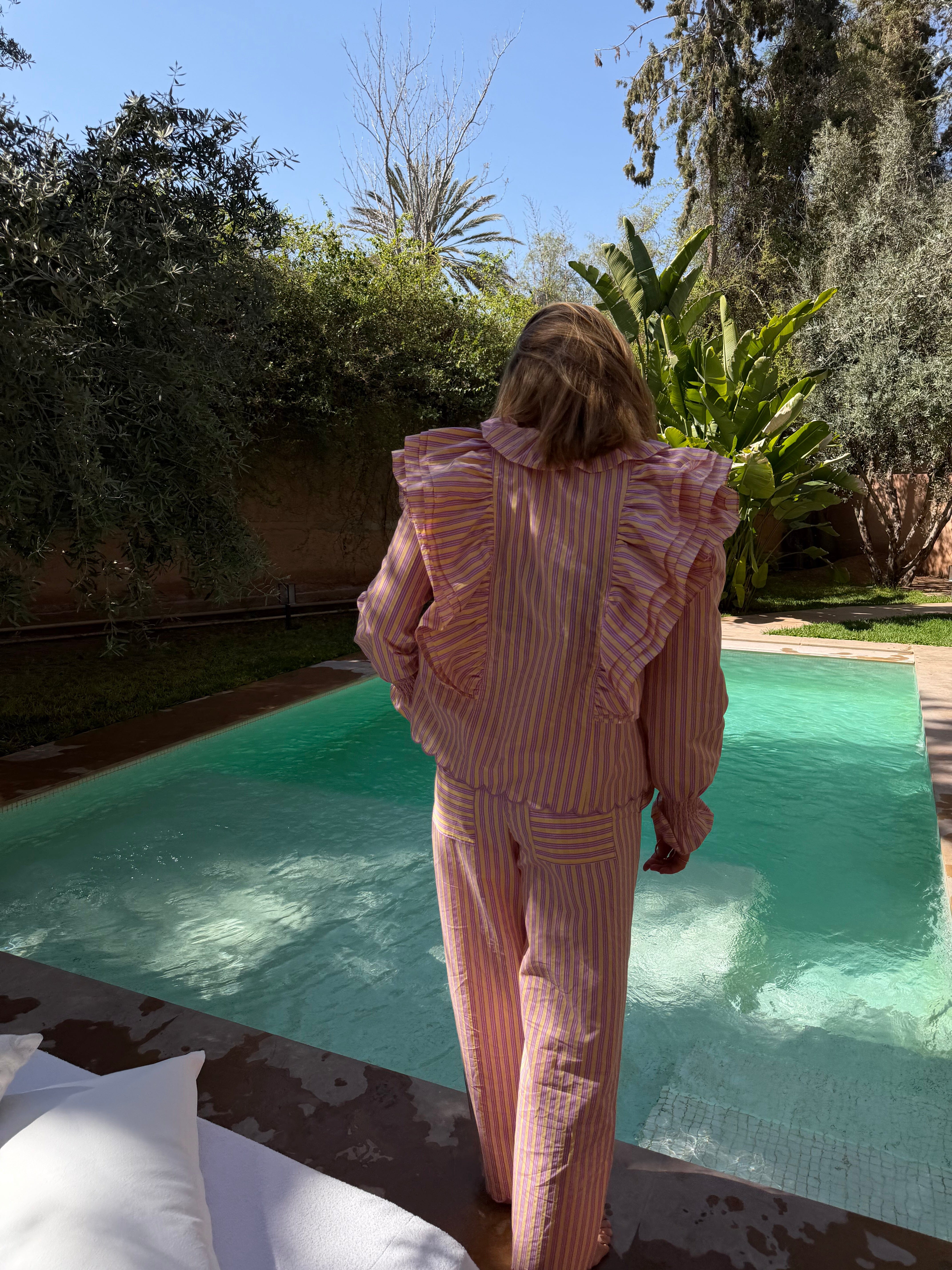 A love letter to spring. Introducing the SILENT ROSE HEAT SHIRT, a piece designed to bring a touch of romance to your everyday wardrobe. The cheerful yellow and pink stripes are complemented by a beautiful scalloped edge on the sleeves and bottom, adding a delicate, vintage-inspired charm. It is a silhouette that embraces both comfort and effortless grace.Perfect for sun-drenched afternoons and heartfelt conversations.